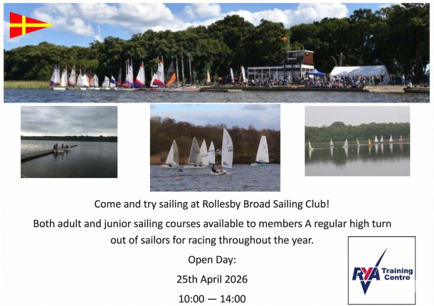 Open Day 25th April Come and try sailing at Rollesby Broad Sailing Club! Open Day 25th April 202610:00 — 14:00 Both adult and junior sailing courses available to members A regular high turnout of sailors for racing throughout the year. Grab the PDF to display it elsewhere.